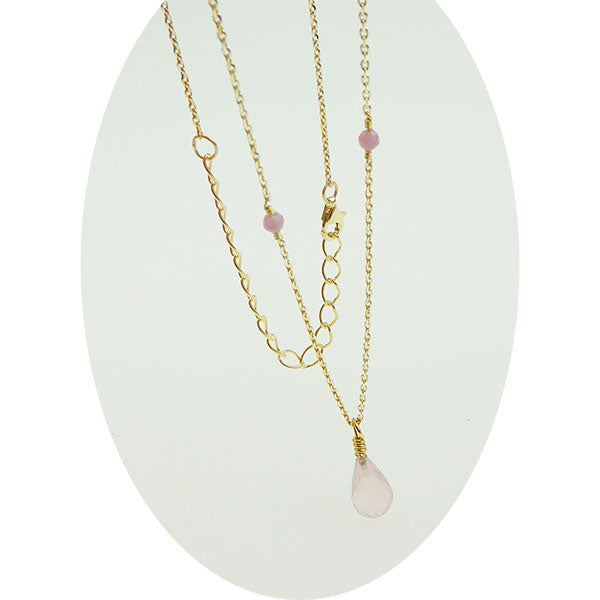 42cm silver chain necklace in a yellow gold finish with a rose quartz pendant and 8cm extender. Designed and manufactured in Denmark by San.