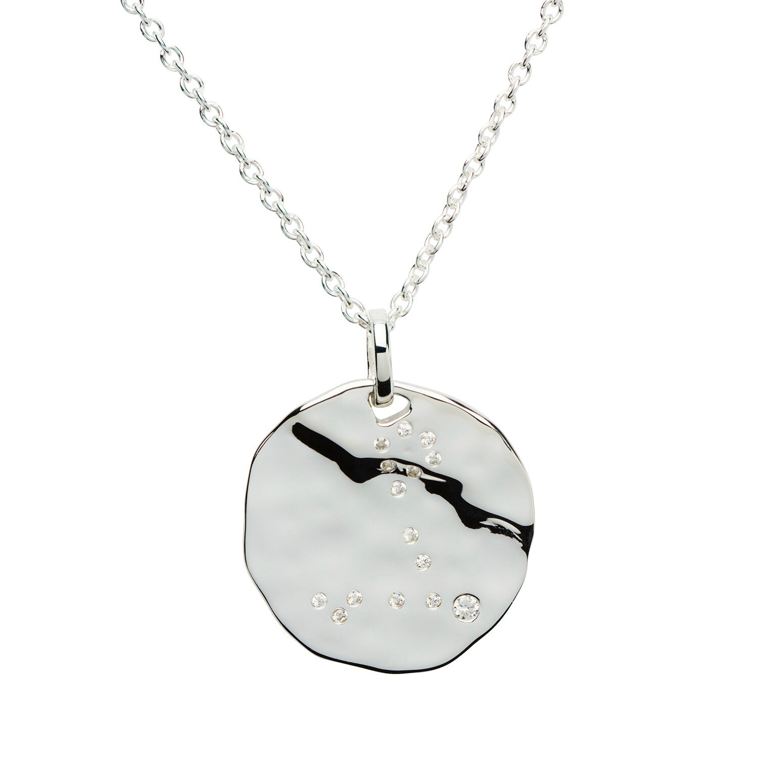 Silver lightly hammered pendant. This pendant is set with CZ stones representing the constellation of Pisces. Supplied on a 45cm silver chain.
