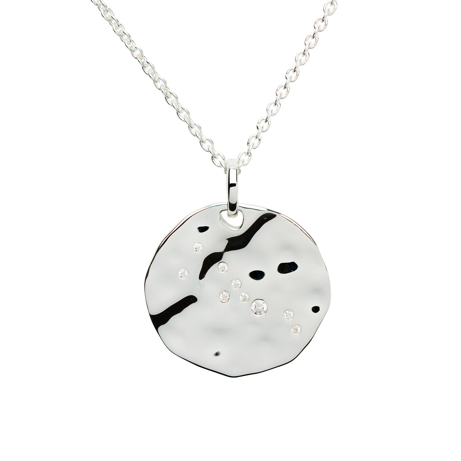 Silver lightly hammered pendant. This pendant is set with CZ stones representing the constellation of Taurus. Supplied on a 45cm silver chain.