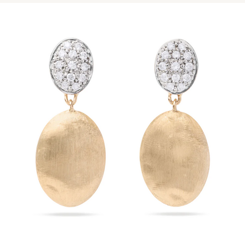 18ct yellow gold Siviglia drop earrings set with 0.20ct diamonds. Hand engraved using the time-honoured Bulino technique.
