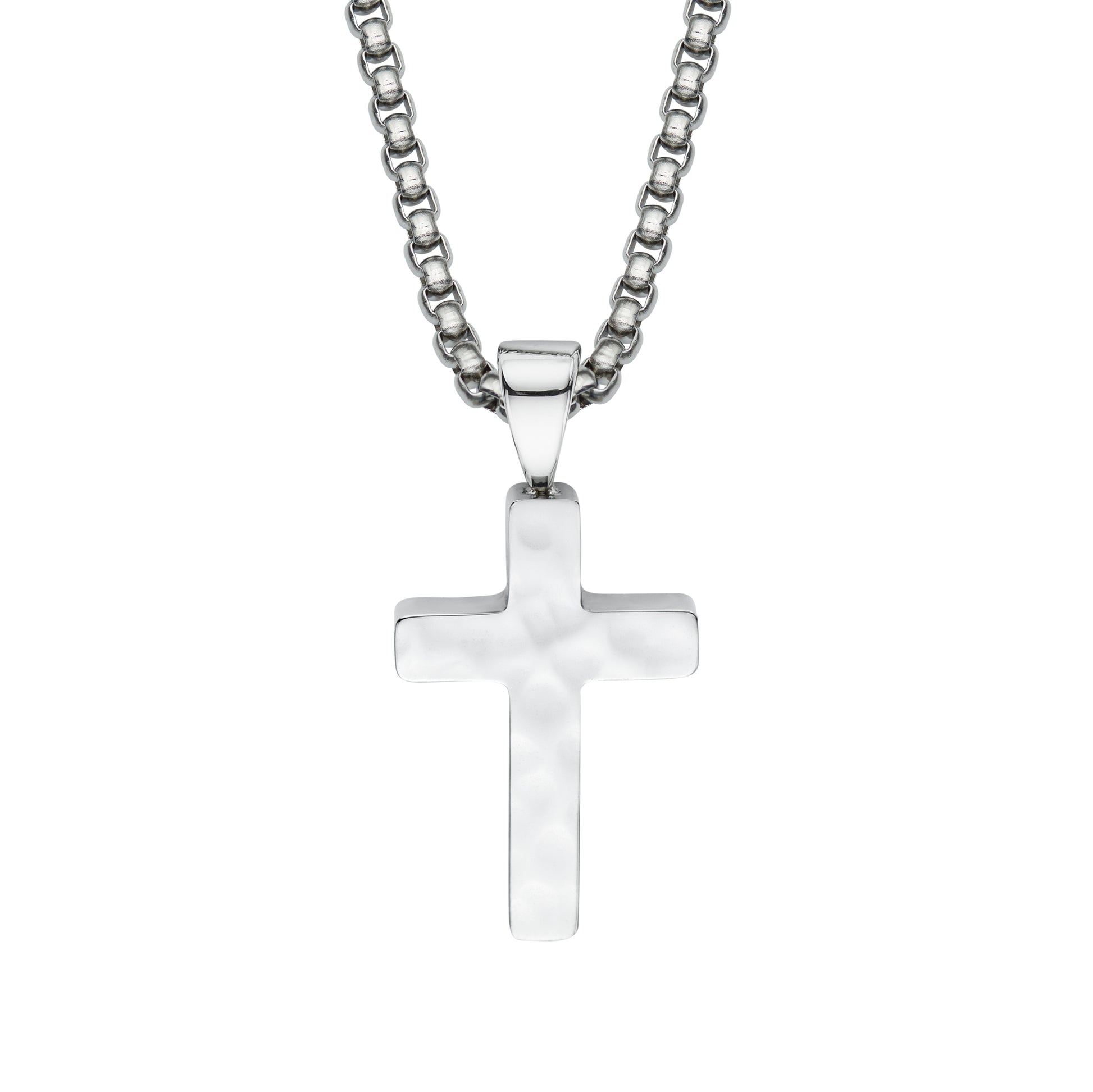 Stainless steel chain with a hammered steel cross in a matte and polished finish. Pendant approximately 23mm x 10mm.