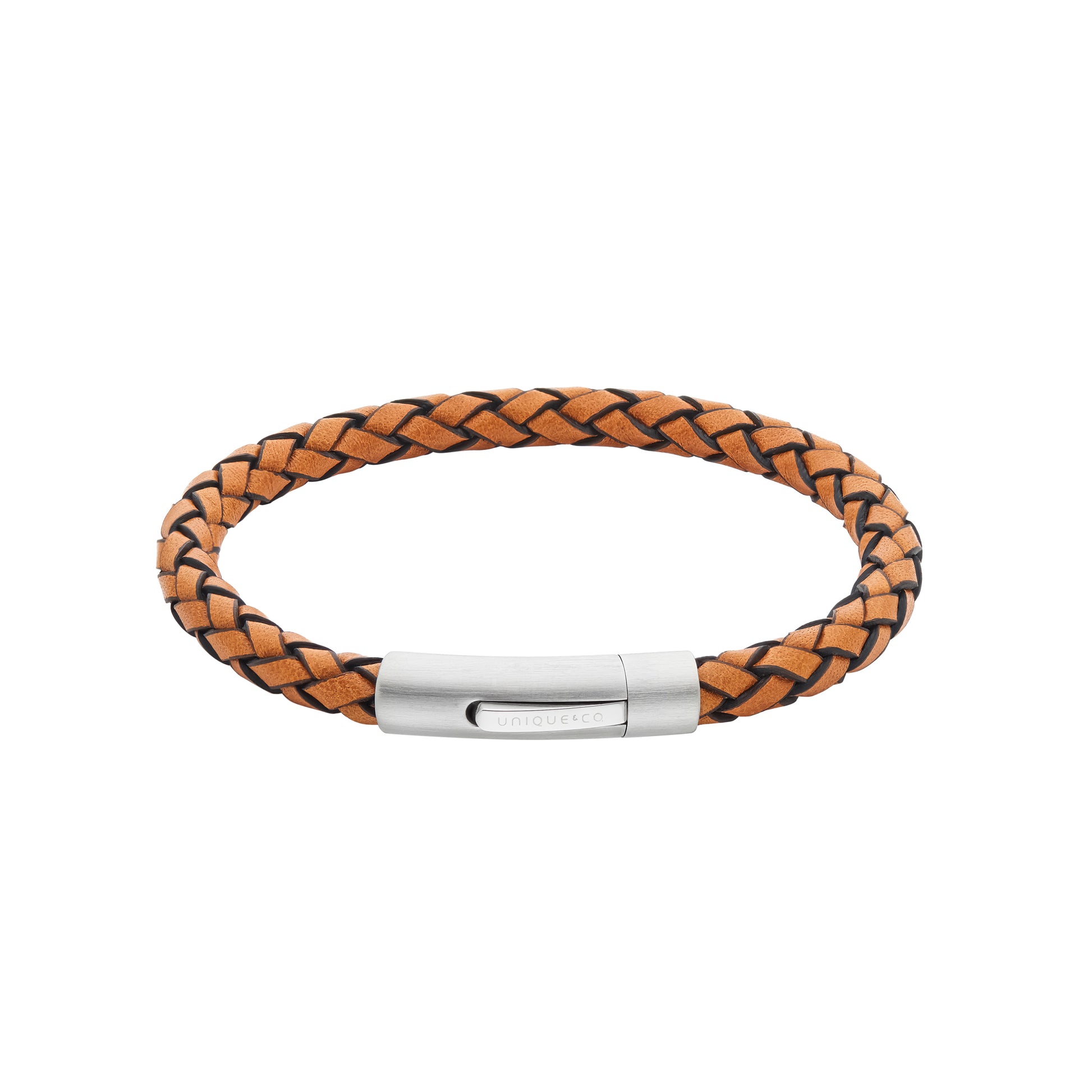 Tan braided leather bracelet with a matte/polish finish steel clasp.