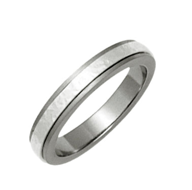 4mm titanium ring with a raised precious metal centre in the sandstone texture finish. Handmade in the UK.