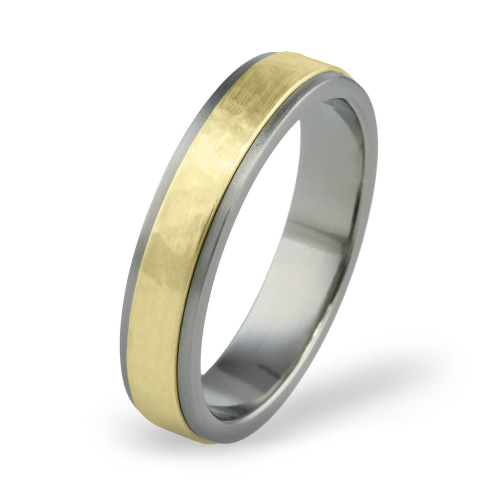 6mm titanium ring with a raised precious metal centre in the sandstone texture finish. Handmade in the UK.