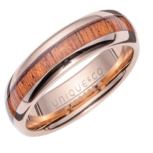 6mm tungsten ring with a rose IP plating and wood inlay.
