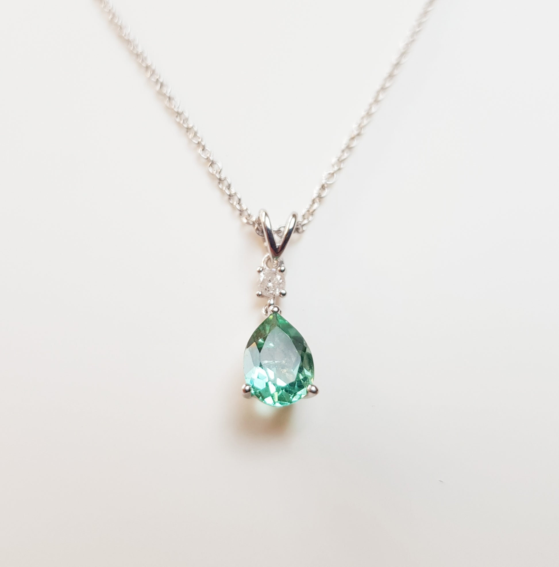9ct white gold pendant claw set with pear shaped green quartz that hangs beautifully from a single brilliant round diamond. Supplied on a 45cm white gold chain.